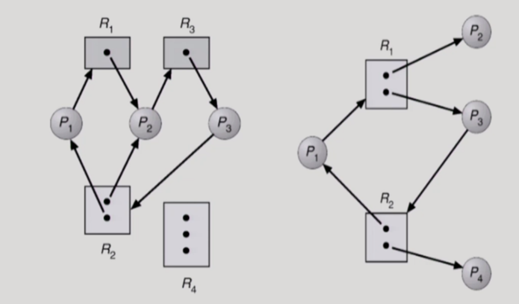 ์ผ์ชฝ ๊ทธ๋ํ์ ๊ฒฝ์ฐ, ๋ชจ๋ ํ๋ก์ธ์ค๊ฐ ์ ์ ์ ๋๊ธฐ ์ํ์ด๊ณ ์ํ๋๊ธฐ ์ํ์ด๋ค. ๋ฐ๋ผ์ ๊ต์ฐฉ ์ํ์์ ์ ์ ์๋ค.